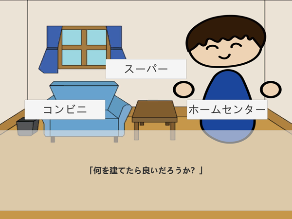町の代表となった主人公が市民の意見を聞き、みんなが過ごしやすい町作りを目指す選択型のクイズゲームとなっています。最終的に町にはたくさんの建物が建つのでどのような街になるのか自身の目で確かめてほしいです。