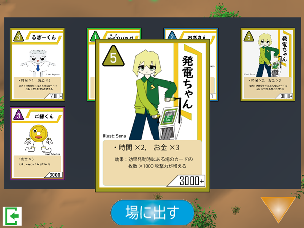 二人対戦型のカードゲームです。SDGsに関連するキャラクターたちが描かれたカードを使い、二人でキャラクターがどんなSDGsの問題について意味するのかを考えながら戦うゲームです。