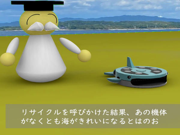 リサイクルについて注目したCG動画です。博士とルンベイが海のゴミを掃除するロボに乗って墜落し、そこからリサイクルを学んで、呼びかけていく、というあらすじです。